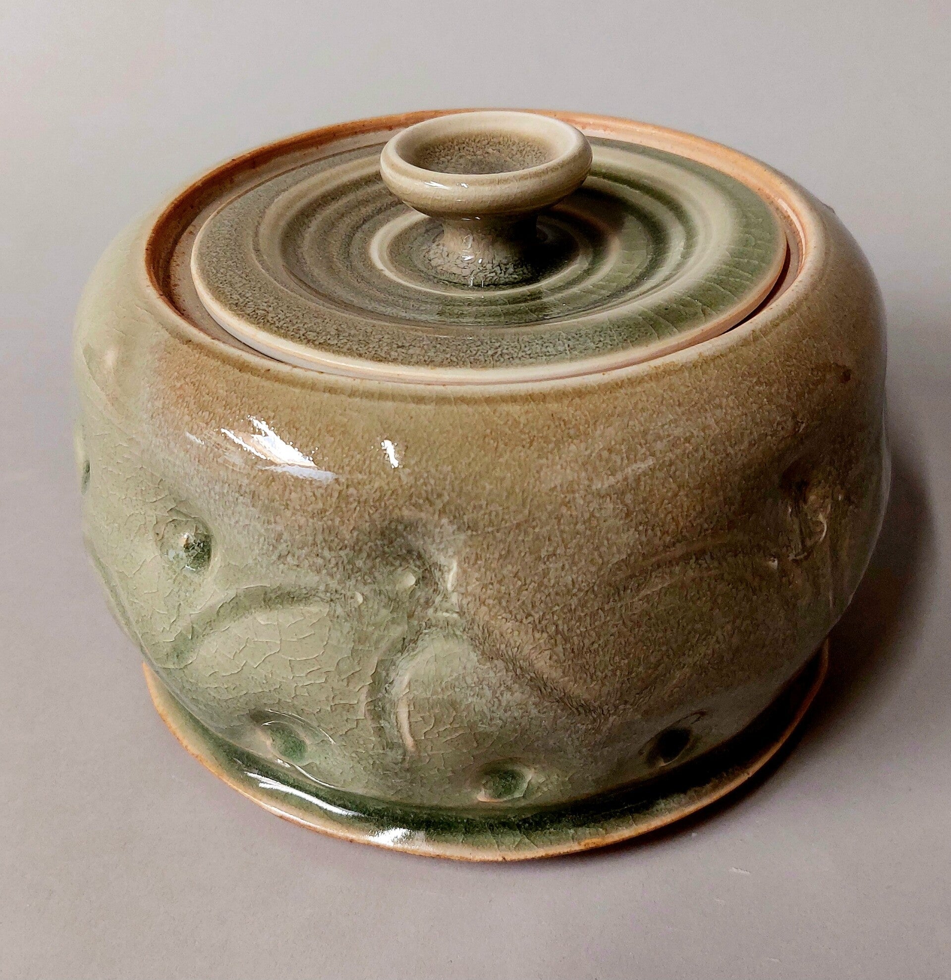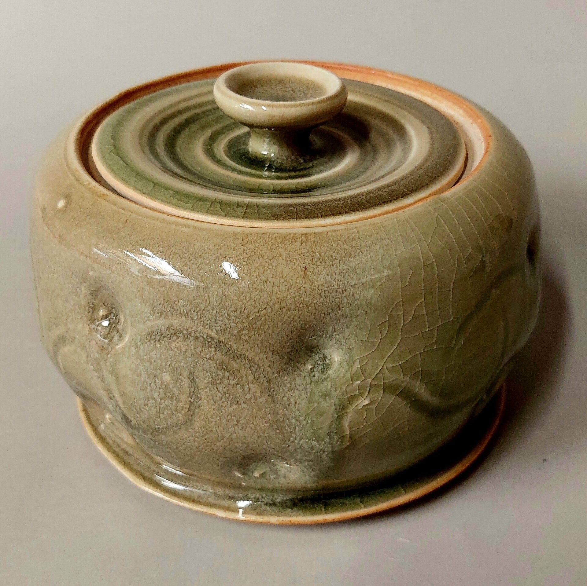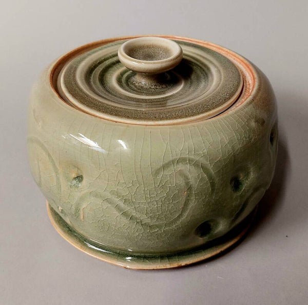 dekselpot in dirty porselein geglazuurd met celadon en gestookt in de fat phoenix tot 1300°C