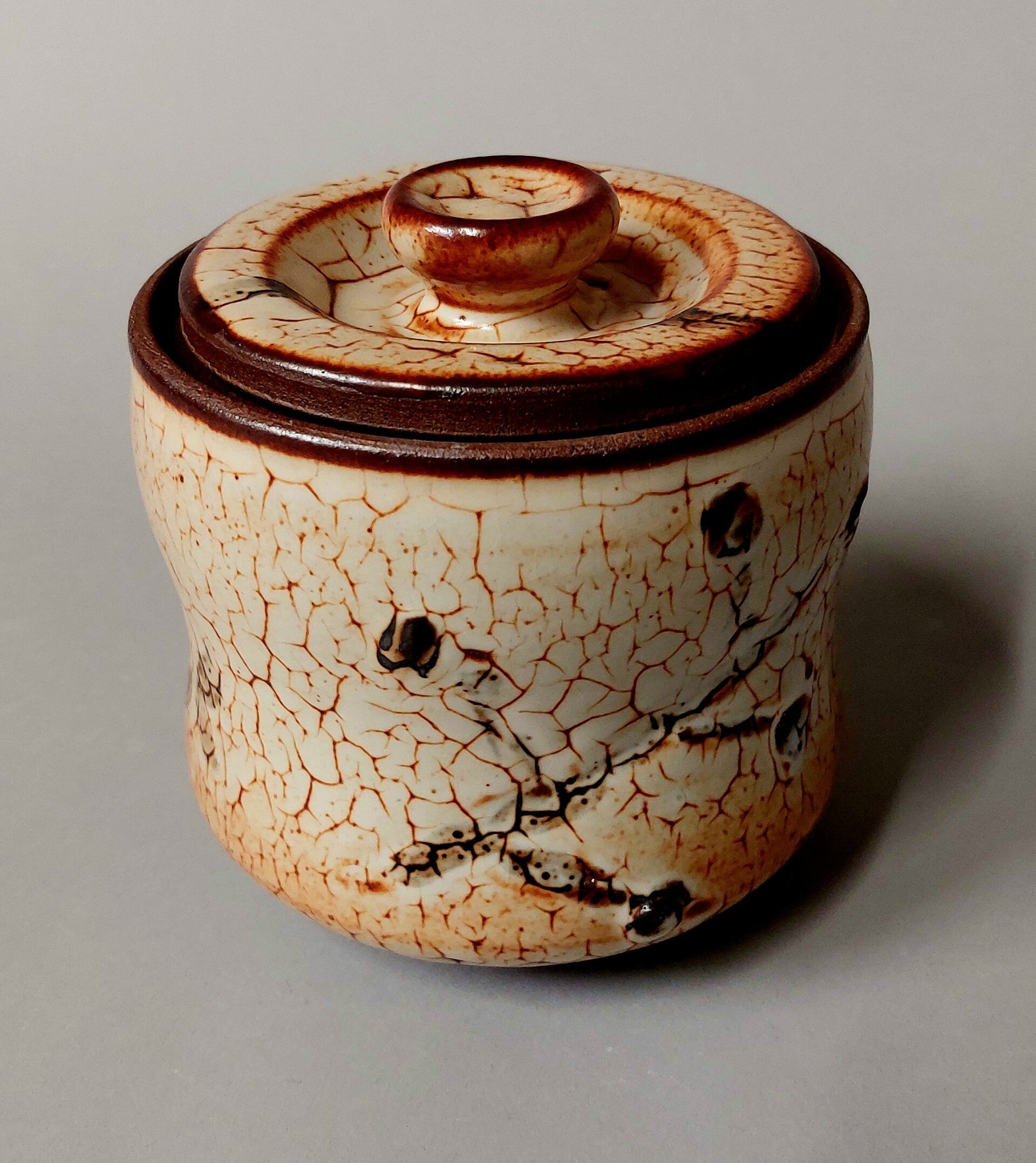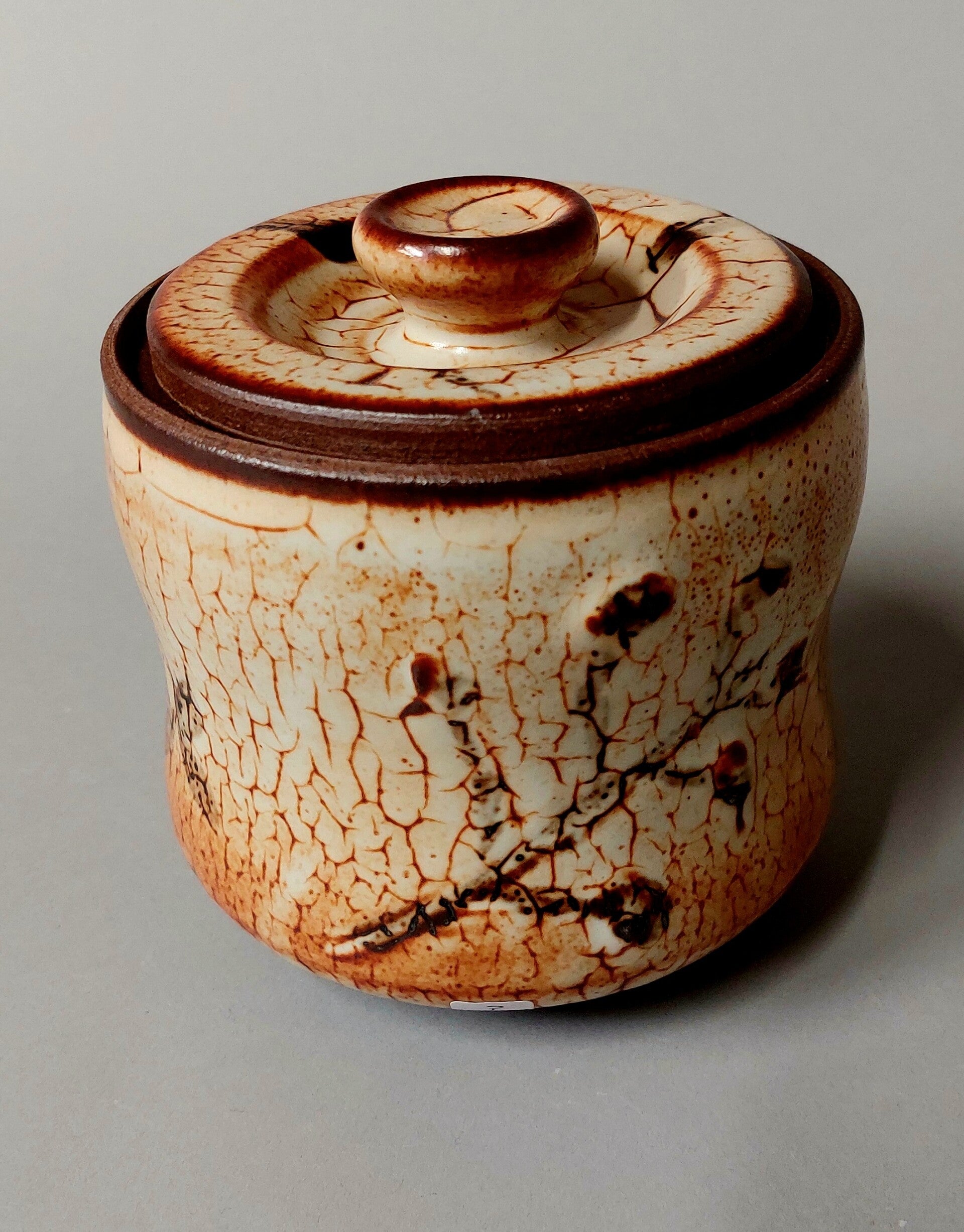 dekselpot in ijzerhoudende steengoedklei, geglazuurd met 3 shino's in superpositie en gestookt in reductieatmosfeer tot 1300°C