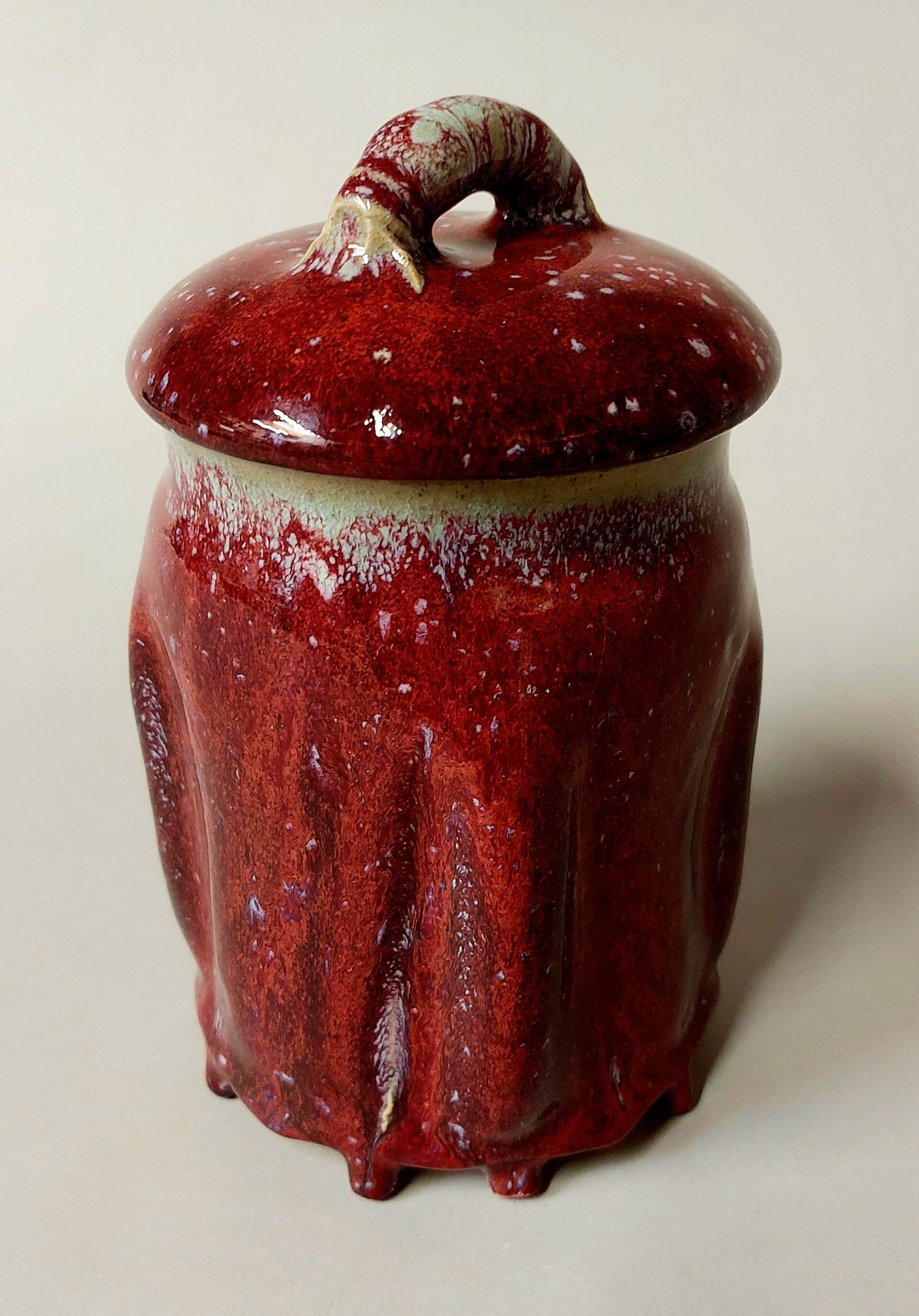 dekselpot in steengoed met ossebloed glazuur gestookt in de gasoven tot 1280°C in reductieatmosfeer