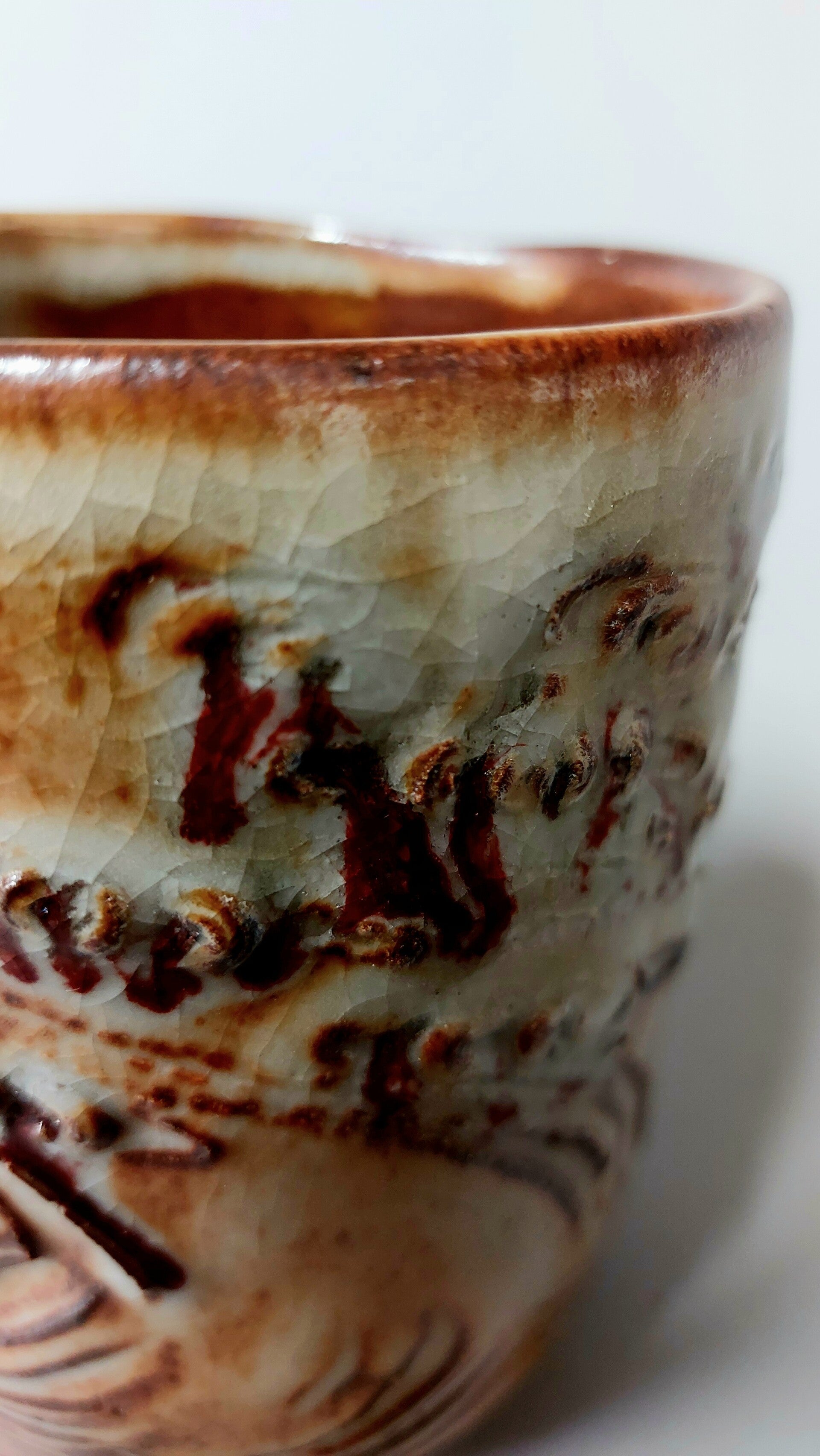 beker/mok zonder oor in ijzerhoudende steengoedklei, geglazuurd met een shinoglazuur en hier en daar wat ossebloed in superpositie en gestookt in reductieatmosfeer tot 1300°C