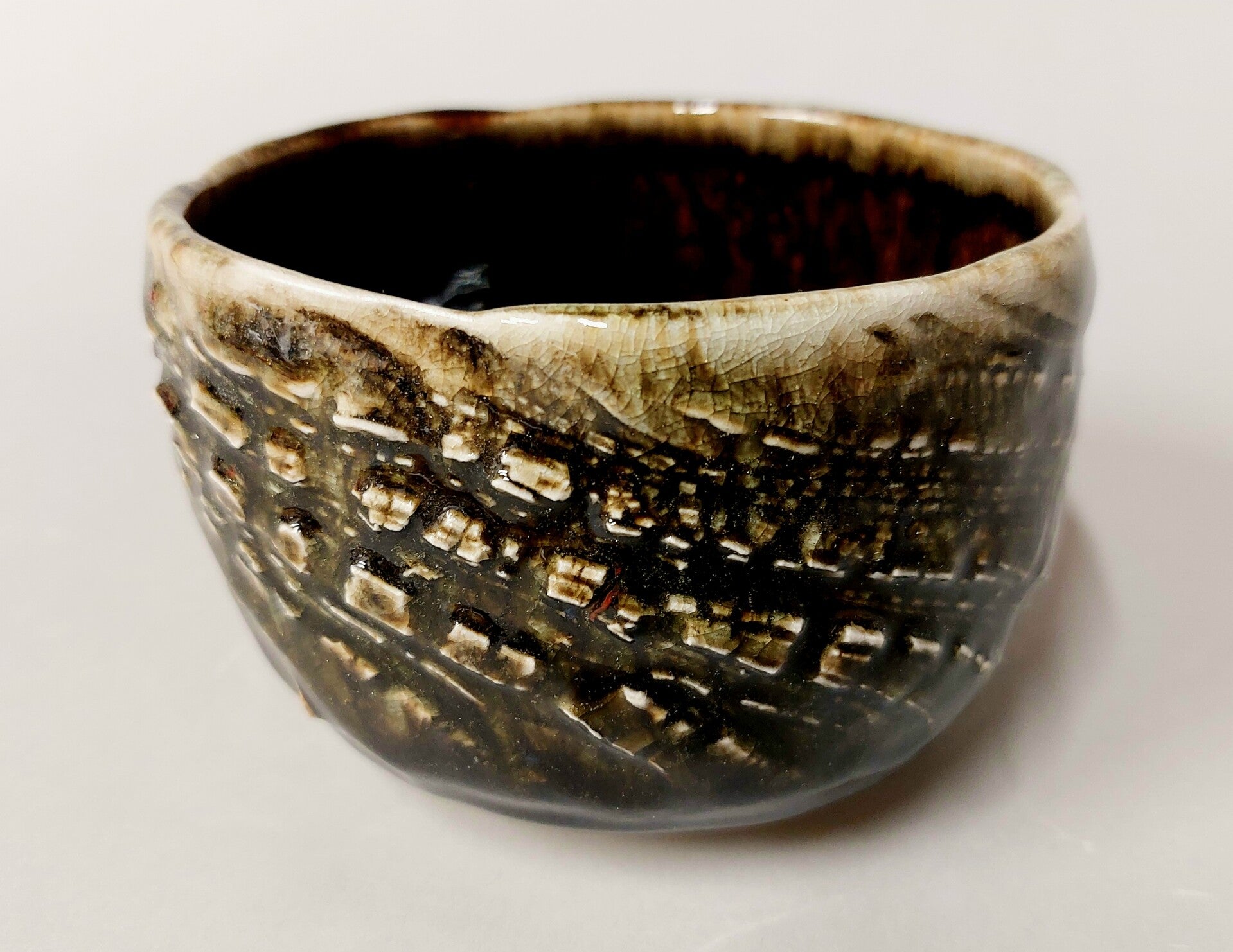 chawan in ijzerhoudende steengoedklei, geglazuurd met een shinoglazuur en ossebloed in superpositie wat een schoon olijfgroen oplevert en gestookt in reductieatmosfeer tot 1300°C