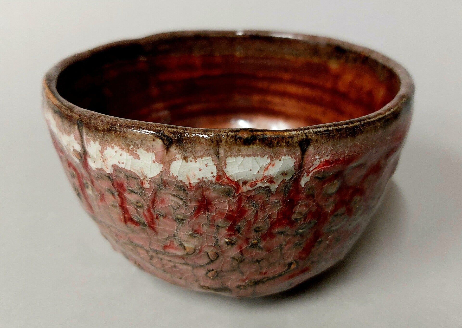 chawan in ijzerhoudende steengoedklei, geglazuurd met 3 shino's en ossebloed in superpositie en gestookt in reductieatmosfeer tot 1300°C