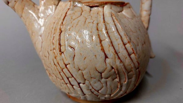 theepot in westerwald steengoedklei, geglazuurd met 3 shino's in superpositie en gestookt in reductieatmosfeer tot 1300°C