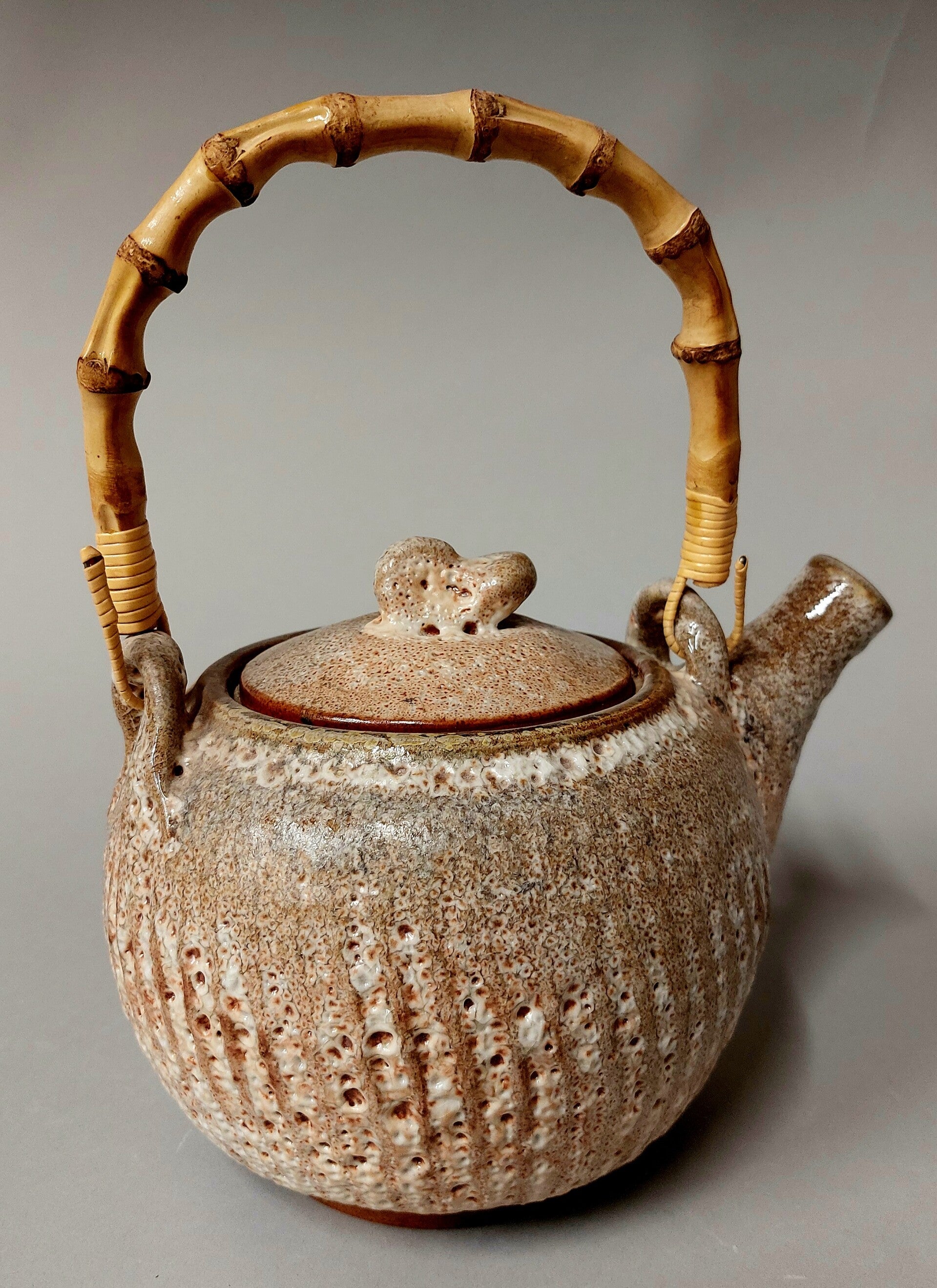 theepot in ijzerhoudende steengoedklei, geglazuurd met 3 shino's in superpositie en gestookt in de anagama 1320°C